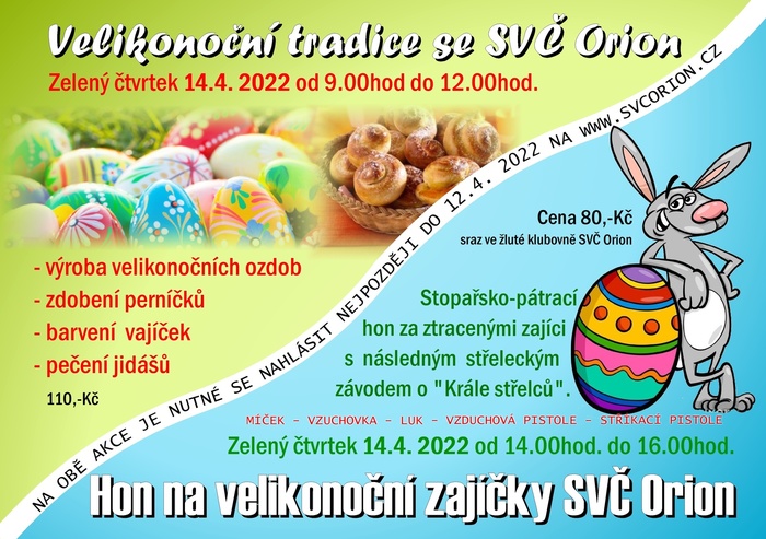 Velikonoční turnaj ve všemožných střeleckých disciplínách. První zajíčky vystopujeme a potom si v různých střeleckých disciplínách užijeme spoustu zábavy. Strat akce bude ve 14.00 v klubovnách SVČ, další průběh akce bude probíhat venku. Předpokládaný konec je v 16.00hod. Cena za akci je 80,-Kč.
