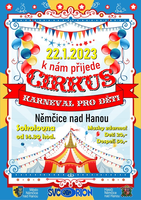 V neděli 22.ledna 2023 se na všechny děti těší cirkusové šapitó v Němčické sokolovně, kde pod taktovkou principálů ze SVČ Orion proběhne tradiční dětský karneval. Ve spolupráci s městem Němčice nad Hanou a SDH Němčice nad Hanou jsou pro všechny připraveny parádní soutěže, bohatá tombola a skvělé občerstvení.