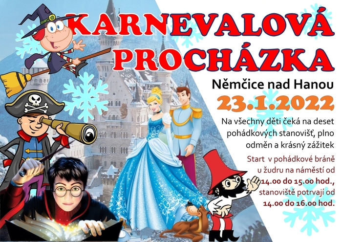Bohužel pořádat klasický dětský karneval ještě aktuální situace nedovoluje, proto vás zveme na alternativní krásnou Karnevalovou procházku v neděli 23. ledna 2022. Bude na vás čekat deset pohádkových stanovišť, na kterých vás čekají zapeklité úkoly, ale také spousta odměn. Doba trvání startu je 1 hodina - od 14.00 do 15.00 a stanoviště budou k dispozici 2 hodiny do 16.00. Je potřeba vyzvednout kartičku na startu, který bude v pohádkové bráně pod žudrem v Němčicích nad Hanou a pak se můžete vydat libovolným směrem na stanoviště podle mapky. Předpokládaný čas strávený na trati je jedna hodina. Těšíme se na vás.