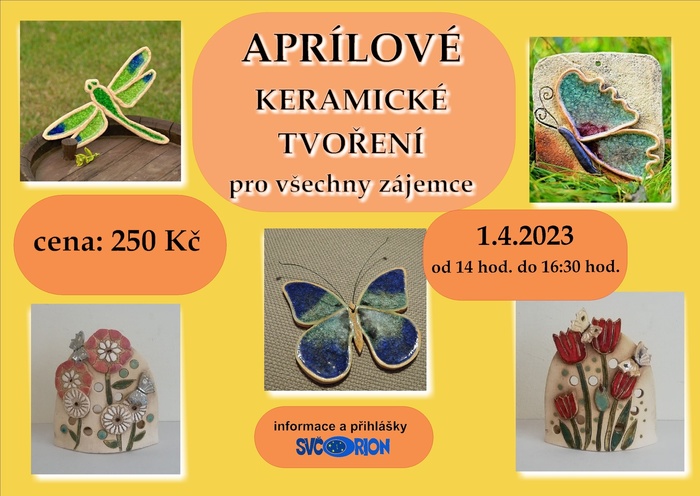 Máte rádi tvoření z keramické hlíny, nebo byste si to chtěli jen tak vyzkoušet? Ideální příležitost je keramické tvoření v keramické dílně SVČ Orion Němčice nad Hanou. Za cenu 250,-Kč máte možnost 1. dubna (není to apríl :-) ) od 14.00 tuto činnost vyzkoušet a něco hezkého vyrobit a odnést si po vypálení domů. Na akci je nutné se předem přihlásit.