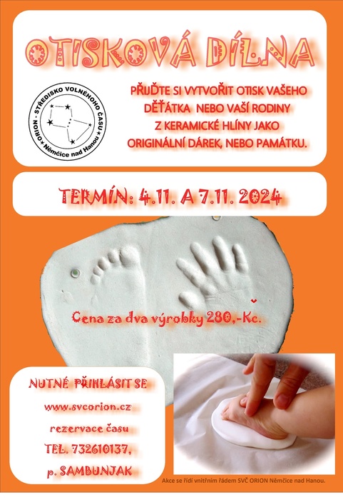 Přijďte si vyrobit originální keramický otisk Vašeho dítěte nebo třeba celé rodiny. Cena za dva výrobky je 280,-Kč. Na akci je nutné se přihlásit a rezervovat si čas na tel. 732 610 137 - Marketa Sambunjak
