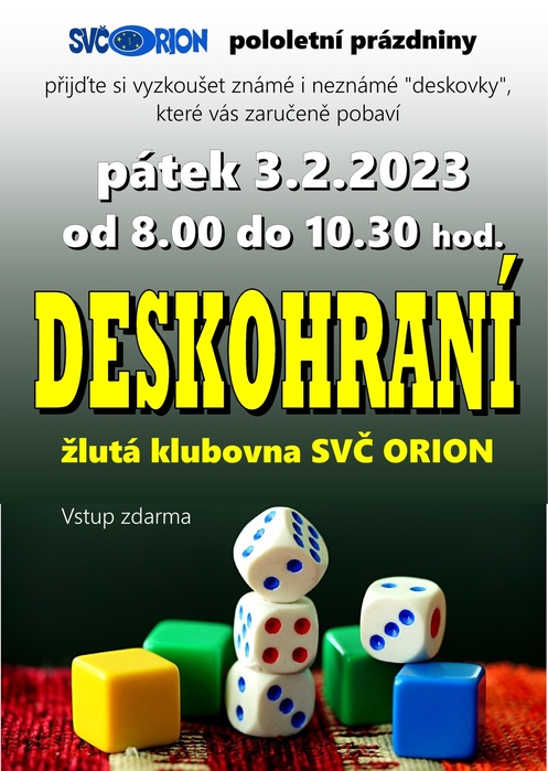 Přijďte si vyzkoušet zahrát nějakou deskovou hru, známou či neznámou. SVČ Orion má ve svém archivu spoustu her, stačí si vybrat. Na akci se předem hlásit nemusíte, dokonce je zdarma. Ideální vyplnění času před odjezdem na druhou akci - bruslení. Akci povede náš přední "deskolog" Honza Bartošík.