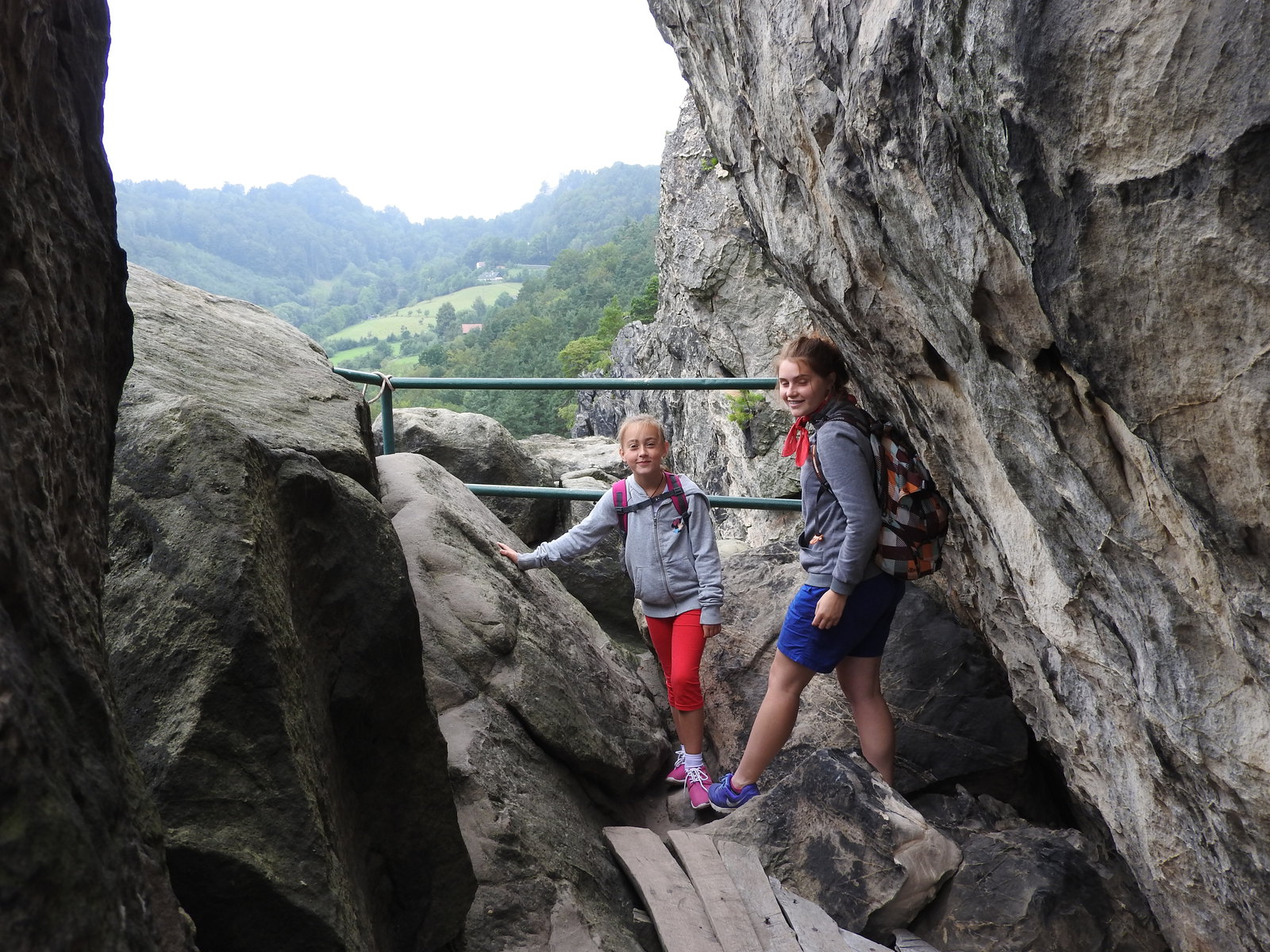 Třetí táborový den jsme si naplánovali  celodenní  výlet do srdce Českého ráje, do Hruboskalska. Počasí si s námi pohrávalo atak jsme snad dvacetkrát oblékali a zase sundávali pláštěnky.  Největší  liják nás stihl při prohlídce hradu Valdštejn a tak jsme se  s úžasným průvodcem ukryli ve zdejší kapli. Byli jsme tam hodinu a on vyprávěl a vyprávěl, všichni jsme ho se se zaujetím poslouchali a někteří u toho i usnuli. Když se vypršelo, vyrazili jsme na zlatou trasu, procházku skalním městem. Nebe se na nás usmálo a my si to mohli užít se vším všudy. Je to opravdu Ráj na zemi.